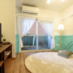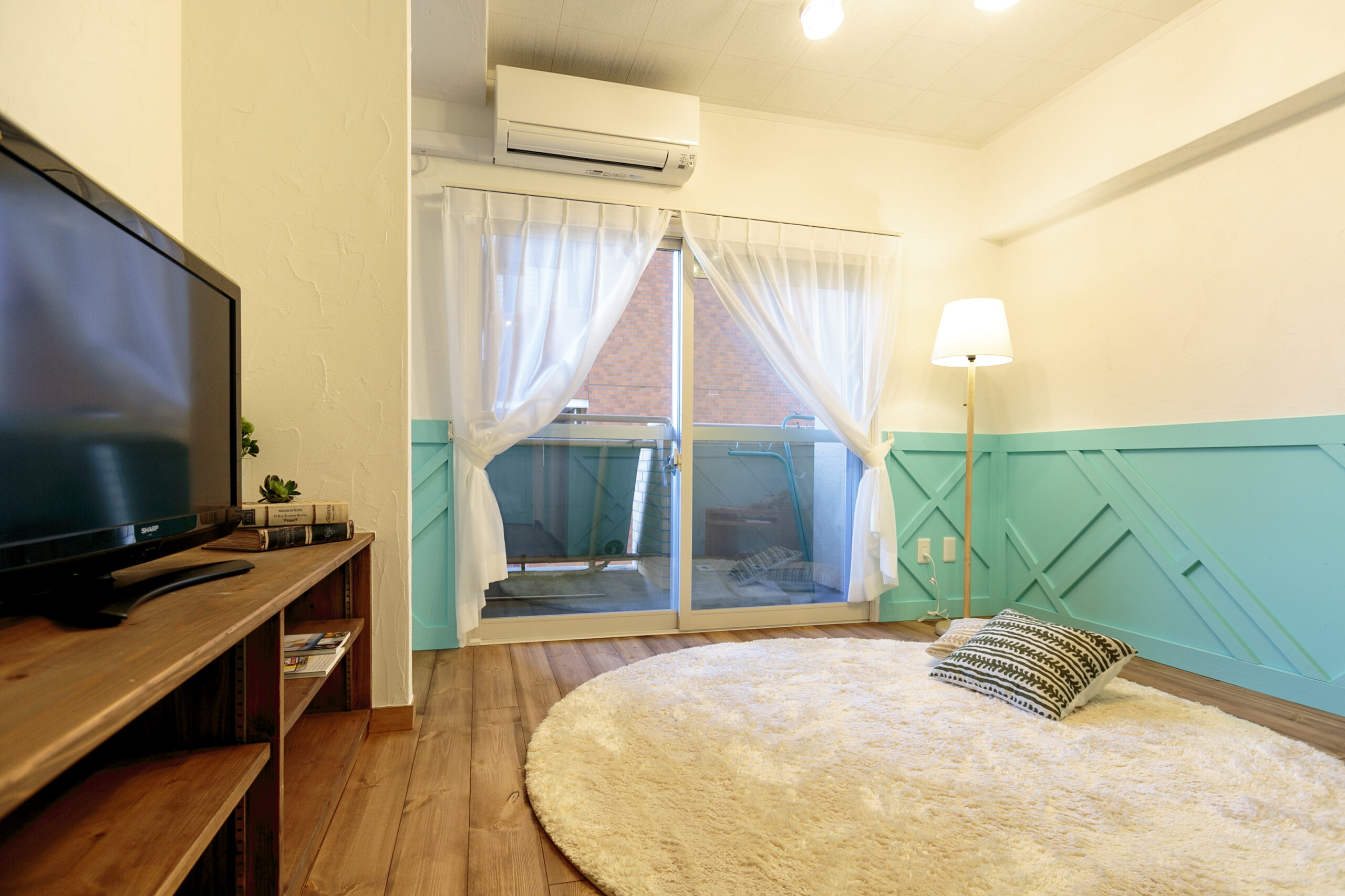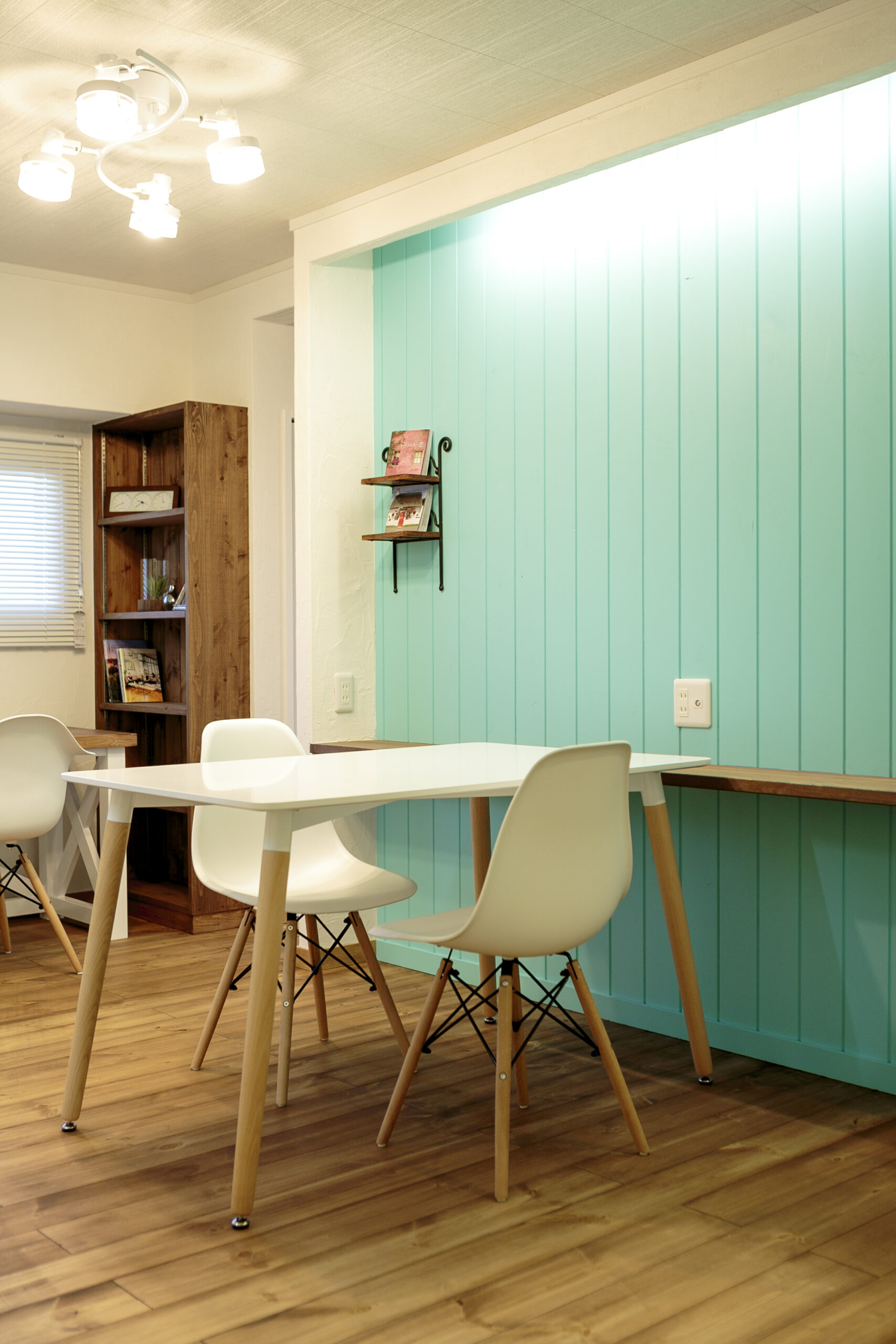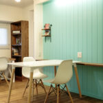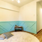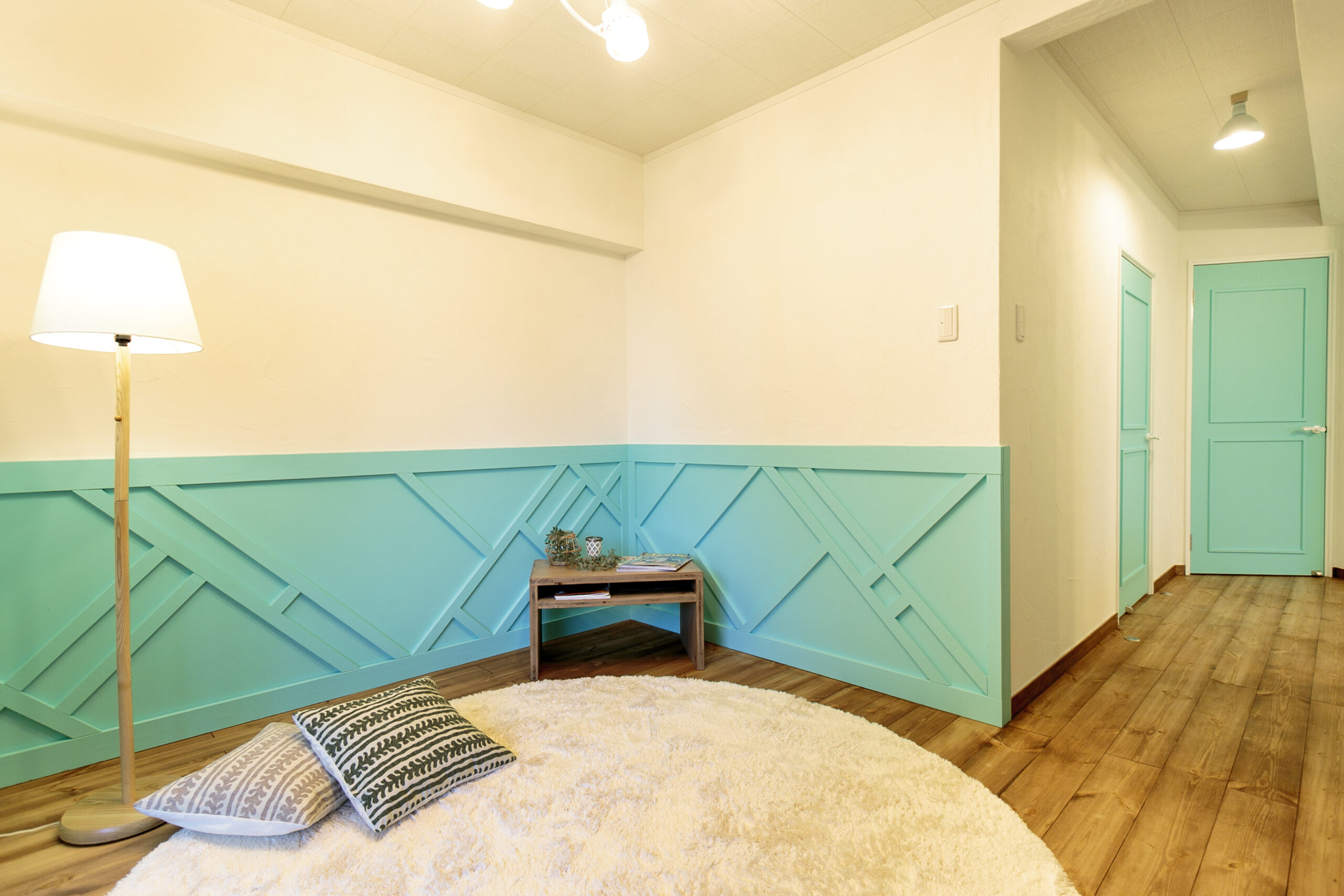 無垢の床と漆喰のやさしい質感に、ティファニーブルーのアクセントが空間を引き締めます マンションでありながら、明るさと遊び心を感じられる、心地よい住まいです